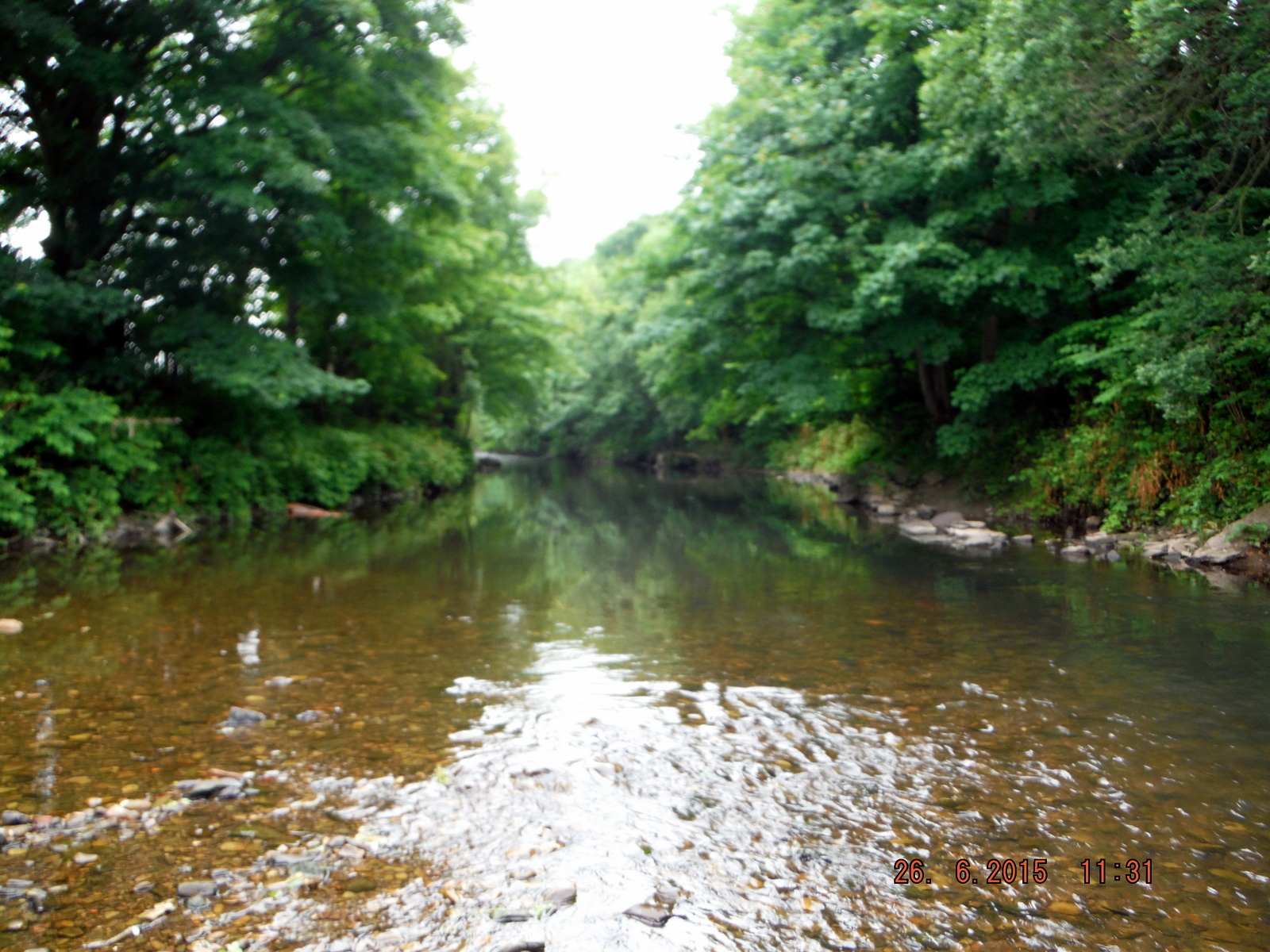 The left of the photo showing dark algae clogged river bed. The right showing lovely bright clean gravel